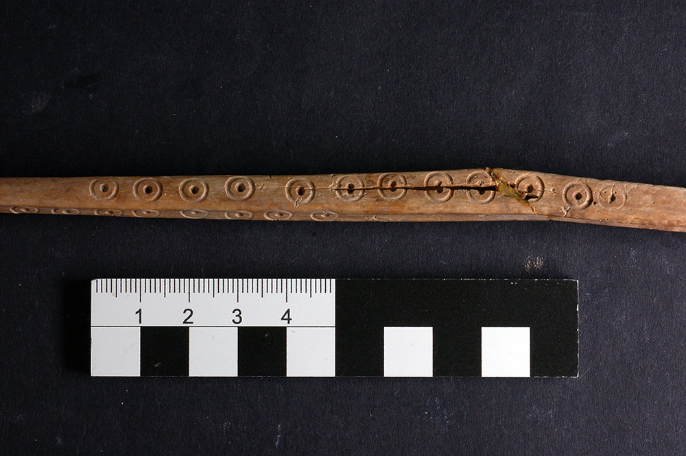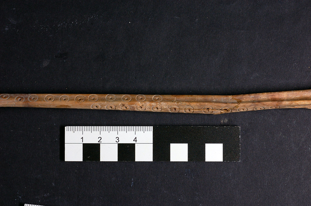 At a closer look, it is evident that wider areas of the bone surface had been carved with a very fine blade, before the ring-and-dot motifs were added. There are also fine transverse cut-marks on the dorsal side of the distal articulation. Obviously, the bone was cleaned from soft tissues and intensively smoothed before it was decorated. There is also polish on the surface of the shaft, especially on raised ridges and exposed edges, whereas the lower-lying motifs and the distal area are less affected. Repeated handling is, therefore, indicated.