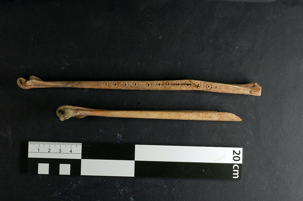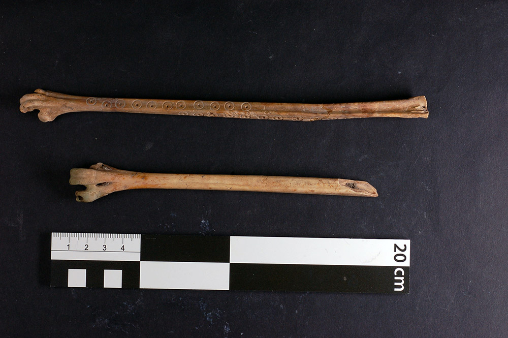 The first specimen is from a Late Roman inhumation burial. According to anthropologic information provided by Ulla Steinklauber, it is from an early adult woman. The artefact was situated between the lower legs of the individual. This grave belongs to a larger cemetery at Stollhofen near Traismauer/Augustianis, one of the auxiliary forts with a vicus along the Danubian Limes in Lower Austria (district St. Pölten). The tarsometatarsus, from the right bodyside, is complete for most of its length, but some substance has been removed from the proximal part and the distal articulations. With a reconstructed total length of about 240 mm, it is comparatively small and slender for a common crane, but still inside the recent variation. There is a recent fracture in the middle of the shaft, which was partially restored.